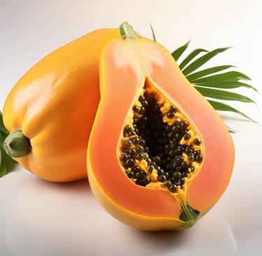La papaya es una fruta tropical originaria de América Central, conocida por su forma ovoide y su piel que varía de verde amarillento a naranja a medida que madura. Su pulpa, de color naranja o rojizo, es dulce, jugosa y contiene numerosas semillas negras y brillantes. La papaya es rica en vitaminas A, C y papaína, una enzima que facilita la digestión.